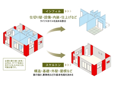 大きな開口部やビルトインガレージ、広々としたワンルームのリビングなどの大空間も安全に実現できるだけでなく、家の内部に構造的に必要な「柱」や「耐力壁」を限りなく減らすことで、「スケルトン&インフィル」という考え方で設計することが可能になり、将来的な間取り変更を自由自在にします。